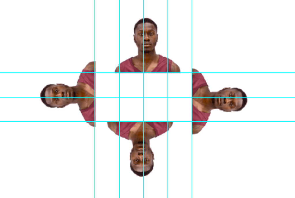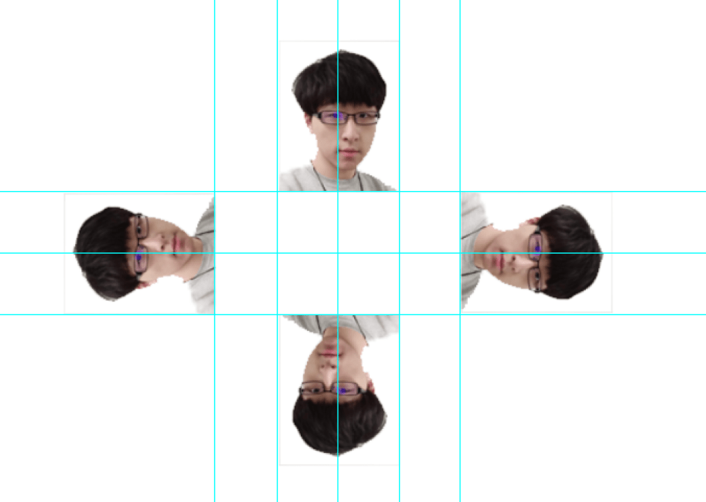 Since non of the members on the group has an extensive experience using video editing softwares we were planning on using ready made hologram videos in order to demonstrate the functionality of the project. However, we decided that in order to make the hologram more personalized to each one of us, to use photoshop and create a still template that consisted of photos us. This was done by using placing 4 photos in the template shown here. The images were aligned in the 90°, 180°, 270° and 360° of rotation.